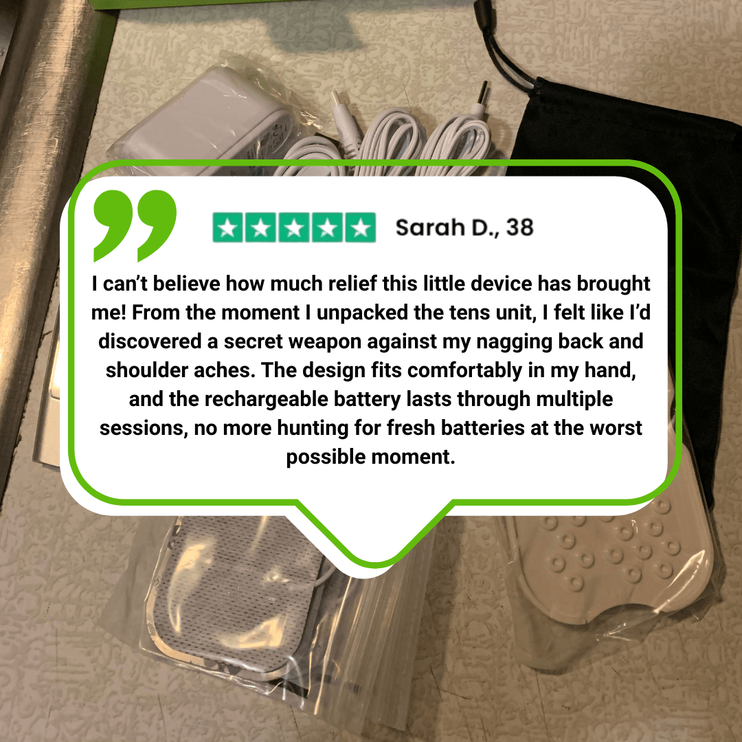 Megan D.Verified BuyerHighly recommended!I’ve had a load of neck issues since i was 60 mainly due to structural problems/instability, and no matter what I do I never seem to be able to get rid of the clenching in my upper traps/suboccipital muscles and it’s making me MISERABLE. I’m working on strengthening my neck with a few kinds of PT, but it seems to only make it worse because we can’t figure out how to get these muscles to let up. It’s awful. The pain can get so bad it makes me puke, and I sometimes can’t sleep even with sedatives because of it. Nothing helps at all: no position, traction, massage, trigger point work… nothing. That’s when i someone on facebook suggested I try a TENS device. I was skeptical at first, but when I placed the pads across my upper traps and neck the gentle electrical pulses actually helped the muscles stop clenching for the first time in forever. It didn’t “fix” it completely, but it took the edge off enough that I could sleep and not feel like I was constantly in a vice grip. Now I use it alongside my medical sessions, and it’s become one of the few things that actually give me relief.
